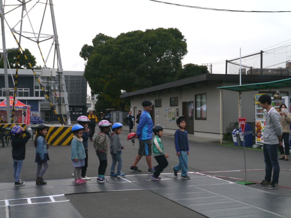 実技レッスンの後、信号や標識のあるコースを歩いて皆で一緒に確認し、自転車にのってルールを守って走る実技テスト。